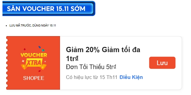 Trong dịp 15.11 này tại Shopee mang tới cho bạn cơ hội săn Voucher Xtra Giảm Đến 1 Triệu Đồng. Đây là ưu đãi bạn không nên bỏ qua khi mua sắm trong dịp này.