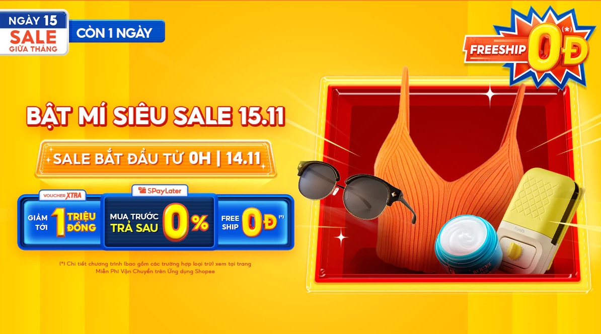 Voucher Xtra giảm tới 1 triệu đồng, SPayLater mua trước trả sau lãi suất 0%, Freeship 0Đ... là những ưu đãi hấp dẫn có trong đợt Sale Giữa Tháng Shopee 15.11 sắp tới. Bạn đã sẵn sàng để bùng nổ cùng chương trình Sale Giữa Tháng 15.11 trên Shopee chưa? Nếu có, hãy đồng hành cùng shopsansan để khám phá đầy đủ các voucher Shopee có trong sự kiện 15.11 sắp tới nhé!